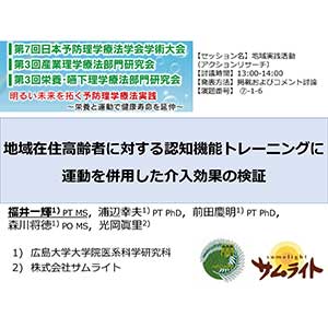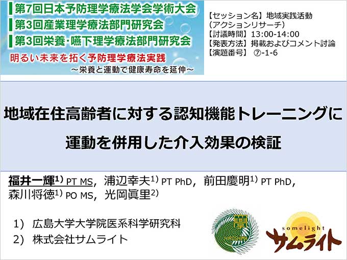2020年9月27日(日)第7回日本予防理学療法学会にて広島大学大学院医系科学研究科と「地域在住高齢者に対する認知機能トレーニングに運動を併用した介入効果の検証」を発表しました。 2020 10/08 お知らせ 2020年10月8日 2020年9月27日(日)第7回日本予防理学療法学会にて広島大学大学院医系科学研究科、株式会社サムライトで「地域在住高齢者に対する認知機能トレーニングに運動を併用した介入効果の検証」を発表しました。 「地域在住高齢者に対する認知機能トレーニングに運動を併用した介入効果の検証」抄録PDFはこちら お知らせ よかったらシェアしてね! URLをコピーしました! URLをコピーしました! 九州大学と株式会社サムライトは、共同研究「行動変容・レジリエンスをうながすチャット型コミュニケーションの研究」の結果を発表しました! LINE公式アカウント『脳若365』のオンライン『通いの場』で展開している、「筑前支えあい広場」の情報が福岡県朝倉郡筑前町のホームページに掲載されました。 関連記事 【国際発表】ISG2026(カナダ・バンクーバー)にて口頭発表を行いました 2026年4月1日 【ご報告】第4回ウェルビーイング学会学術集会(直島)にて研究発表を行いました 2026年3月31日 【論文掲載】ウェルビーイング学会の学会誌「Journal of Wellbeing」創刊号(Vol.1/2025年) 2026年3月30日 国際学術誌「Gerontechnology」に研究論文が掲載されました! 2025年10月14日 国際学術誌「Gerontechnology」に論文が採択されました(フルペーパー) 2025年9月25日 【2025年8月8日】「宗像経済新聞」に掲載されました! 2025年8月8日 <熊本市>2025年6月15日(日)市民会館シアーズホーム夢ホールにて、モザイク型マッチング研究会『スキボラ』キックオフミーティングを開催しました! 2025年6月16日 <熊本市>2025年6月15日(日)モザイク型マッチング研究会『スキボラ』キックオフミーティング開催! 2025年6月10日