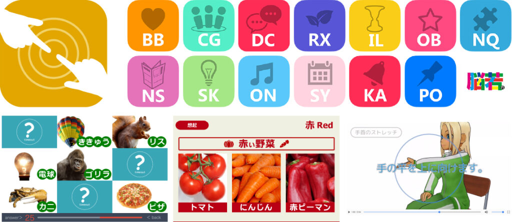 『脳若ステーション』は、教材ツールであるiPad専用アプリ『脳若クラウド』を使って講座を開きます。『脳若クラウド』は、14種類700近くの教材コンテンツの中から季節や場所に合わせたレッスンを選べます。